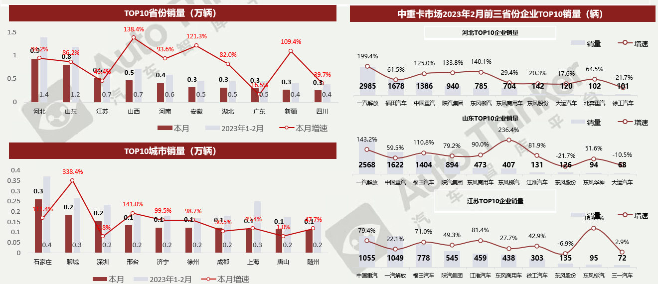 2023年2月,中重卡市场TOP10省份中河北、山东、江苏销量占据前三名,其中河北销量达到9347辆,同比增长94.2%;