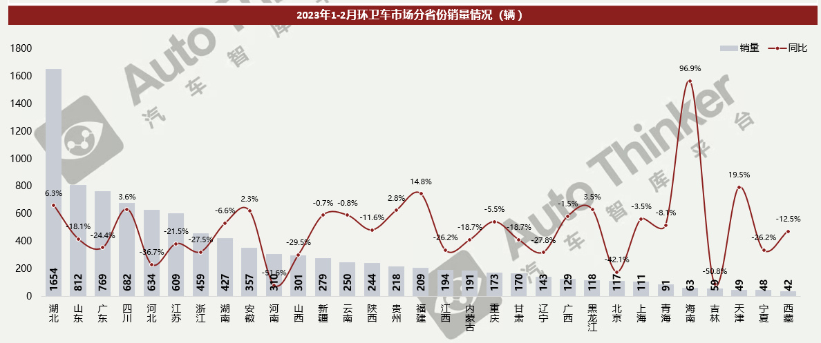 2023年1-2月,所有省份中湖北、山东、广东排在前三名,其中湖北累计销量1654辆,同比增长6.3%。