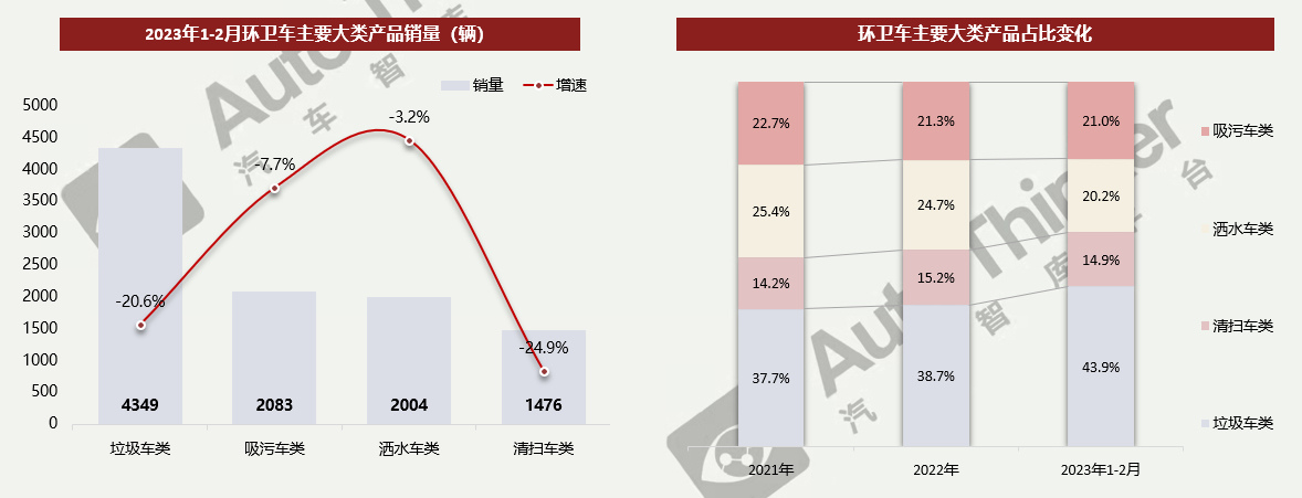 2023年1-2月,环卫车主要以垃圾车类为主,累计销量4349辆,同比下降20.6%;占据市场43.9%的份额,增长5.1个百分点。