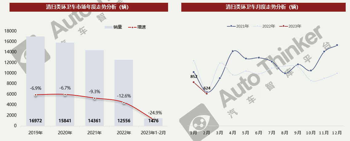 2023年2月,清扫类环卫车市场销售624辆,同比下降9.6%; 2023年1-2月,清扫类环卫车市场累计销售1476辆,同比下降24.9%。