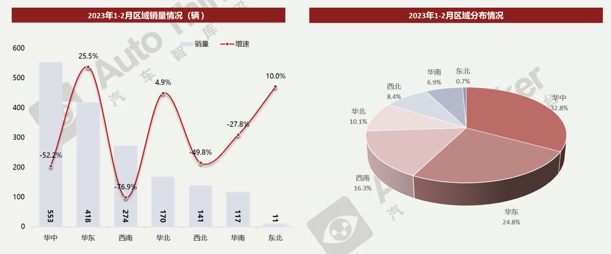 2023年1-2月,混凝土搅拌车销量主要分布在华中地区,累计销售553辆,同比下降52.2%,占据市场32.8%的份额。
