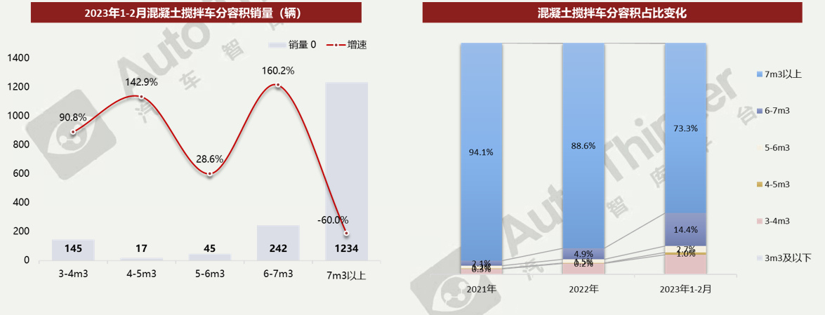 2023年1-2月,搅拌容量方面主要集中在7m3以上容量,累计销售1234辆,同比下降60%;占据市场73.3%的份额,下降15.3个百分点。