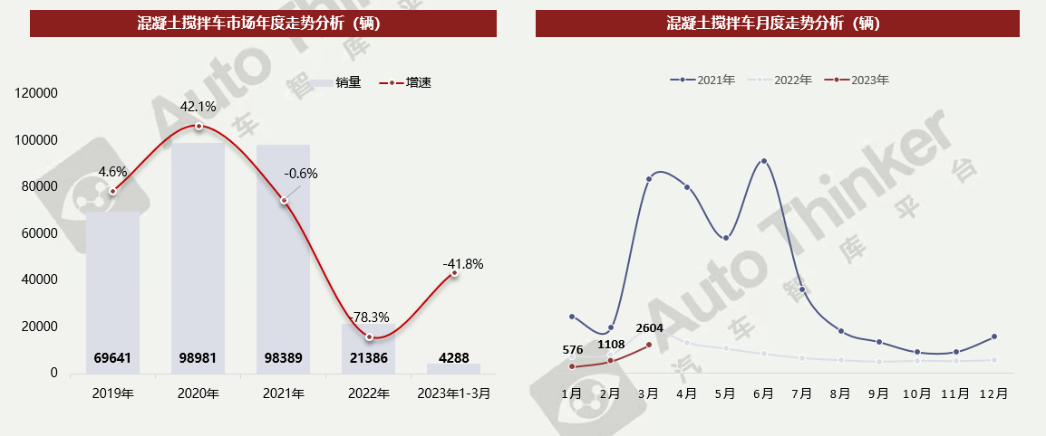 2023年1-3月,混凝土搅拌车市场累计销售4288辆,同比下降41.8%。
