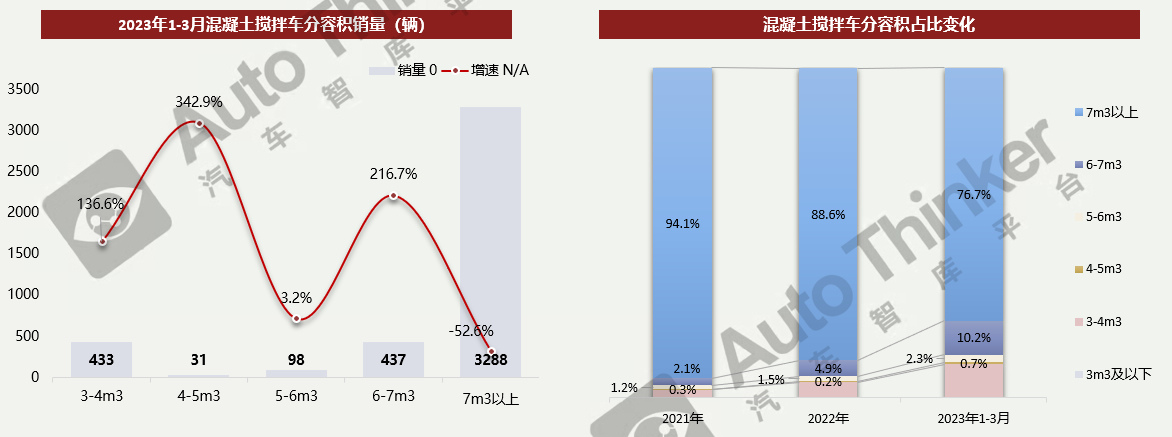 2023年1-3月,搅拌容量方面主要集中在7m3以上容量,累计销售3288辆,同比下降52.6%;占据市场76.7%的份额,下降11.9个百分点。