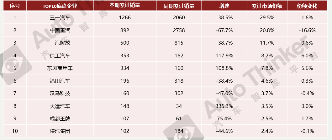 2023年1-3月,TOP10底盘企业中三一汽车、中国重汽、一汽解放销量占据前三名,其中三一汽车累计销售1266辆,同比下降38.5%,占据市场29.5%的份额。