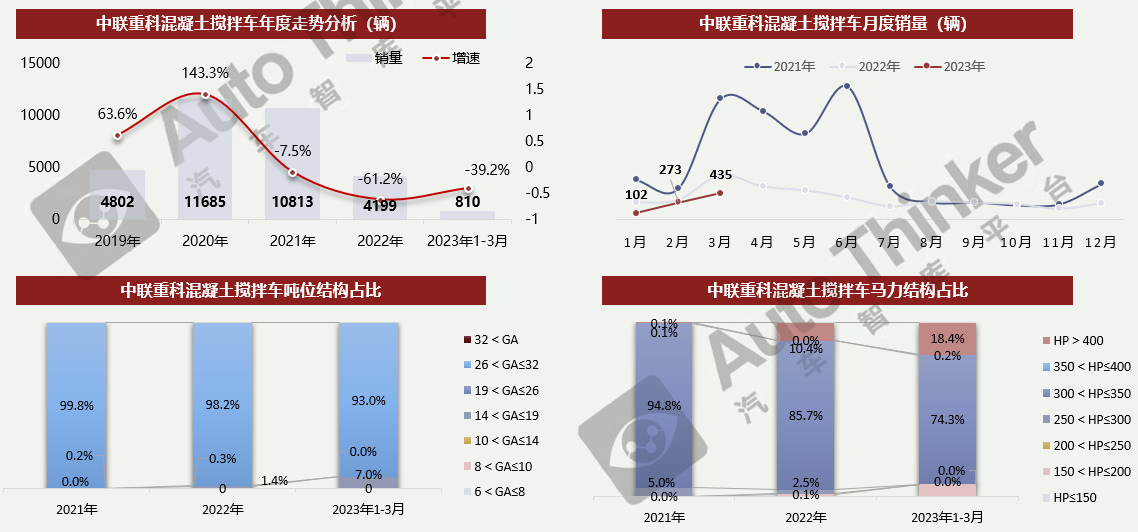 2023年1-3月,中联重科混凝土搅拌车吨位结构主要集中在26<GA≤32吨位段,马力结构主要集中在300<HP≤350马力段。