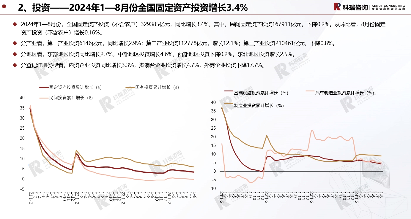 经济政策2024年1—8月份,全国固定资产投资(不含农户)329385亿元,同比增长3.4%,其中,民间固定资产投资167911亿元,下降0.2%。从环比看,8月份固定资产投资(不含农户)增长0.16%。展开
