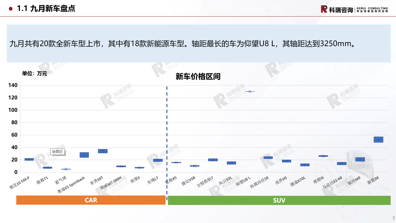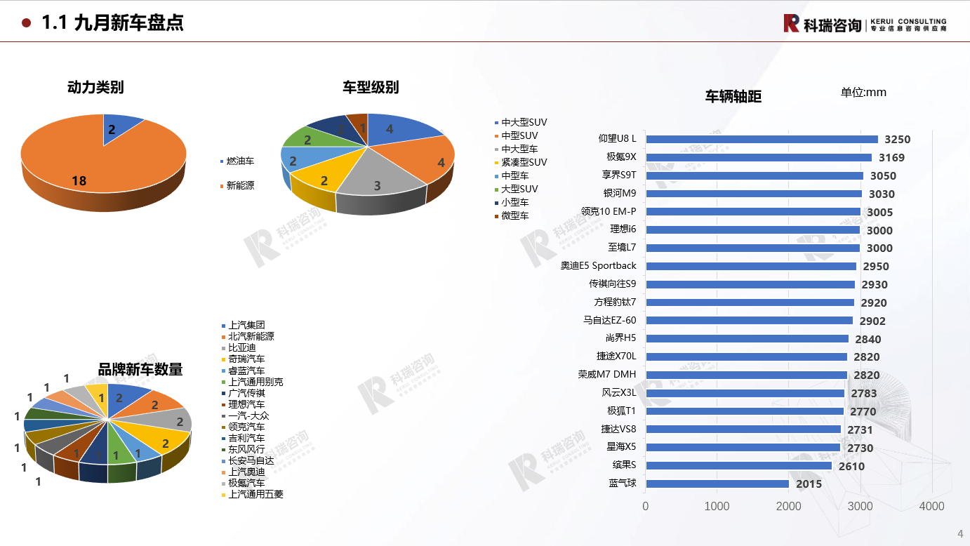 九月共有20款全新车型上市,其中有18款新能源车型。轴距最长的车为仰望U8 L,其轴距达到3250mm。展开