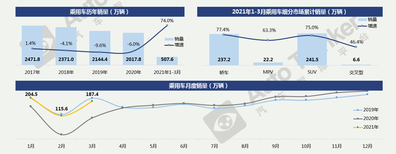 2021年3月,乘用车销售187.4万辆,同比增长77.4%,与2019年3月相比下降7.2%;2021年1-3月累计销售乘用车507.6万辆,同比增长74.0%。2021年前三月市场表现与2019年整体上比较接近,但从乘用车市场整体产销仍低于2019年,且降幅进一步扩大,在市场消费恢复情况向好的背景下,考虑或与芯片供应问题有关。
