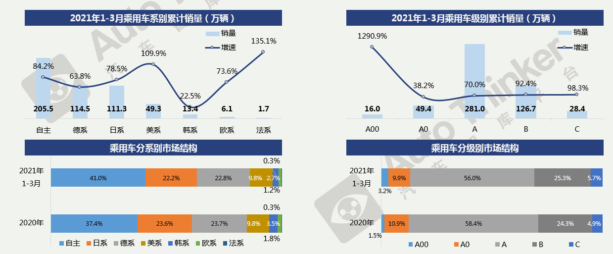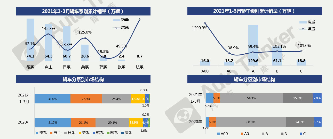 2021年1-3月,德系由大众领衔领跑轿车市场,销量达到74.1万辆。但自主品牌增幅更加亮眼,同比大幅增长145.3%,份额增长近6个百分点。美系份额微升,韩系份额下降1.2个百分点。