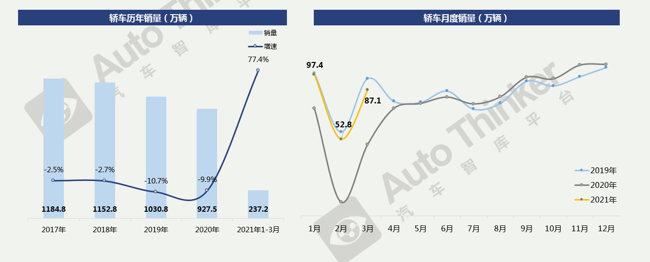 2021年3月,轿车销量为87.1万辆,同比增长77.4%,比2019年下降8.2%,环比上月增长65.0%。前三个月整体走势仍处于2019年之下。