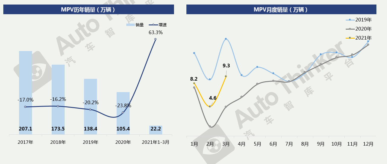 2021年1-3月,MPV累计销售22.2万辆,同比增长63.3%。MPV市场整体仍较为低迷,与2019年差距极大。