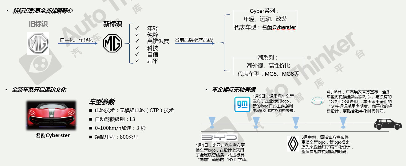 4月7日,MG名爵宣布正式启用全新Logo。新Logo通过细化边框、放大标识、优化内部,更加结构化、扁平化,富有智能感。同时官方宣布推出Cyber全新子品牌,同时透露该产品线目前已规划两款新车,首款量产车型将是一款全新SUV车型,基于全新架构打造,将于今年第四季度上市。名爵Cyberster将开启“共生、共享、共创”全新的玩法,官方宣布,名爵Cyberster将于2021年4月19日在上海车展期间启动众筹,届时将众筹5000万元来决定Cyberster是否真正量产。
