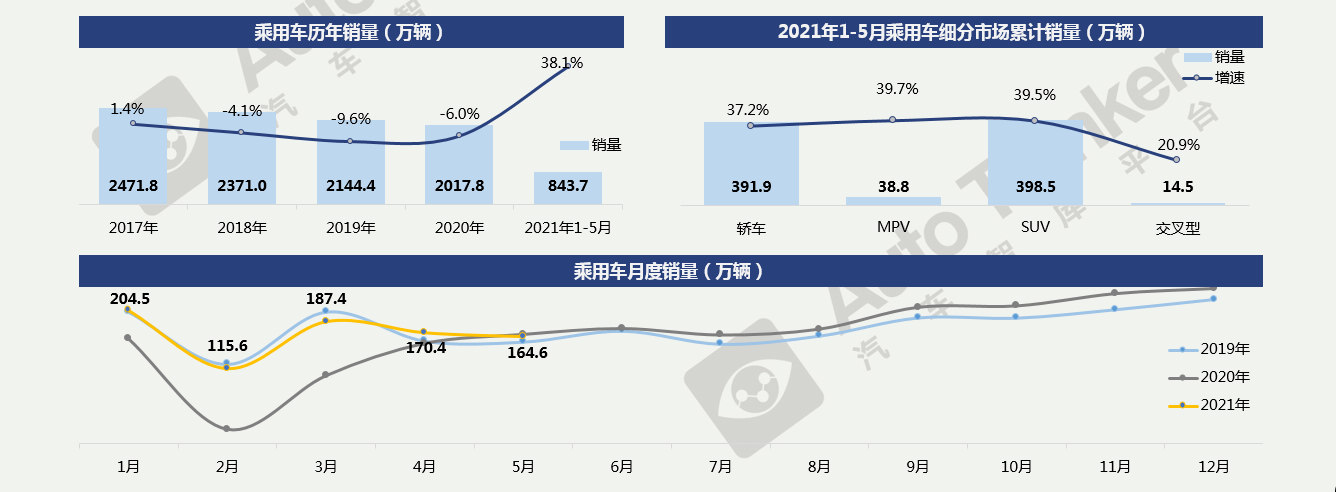2021年5月,乘用车销售164.6万辆,同比微降1.7%;2021年1-5月累计销售乘用车843.7万辆,同比增长38.1%。从市场情况来看,在去年同期基数快速增加的背景下,乘用车增长压力明显增加,产销已呈现小幅下降;但累计数据中,与2019年同期相比,产销形势依然呈现向好发展态势。