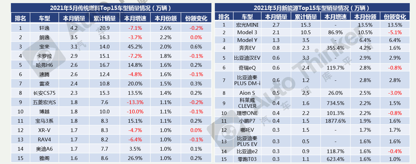5月新能源TOP15车型中,宏光MINI稳居榜首;Model 3排名第二,同比大增,市场份额下降5.1个百分点;Aion S份额持续下跌,产品后劲不足。