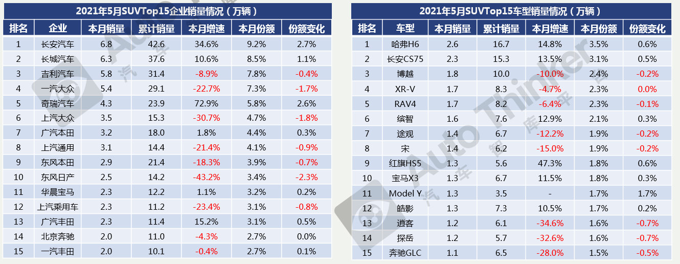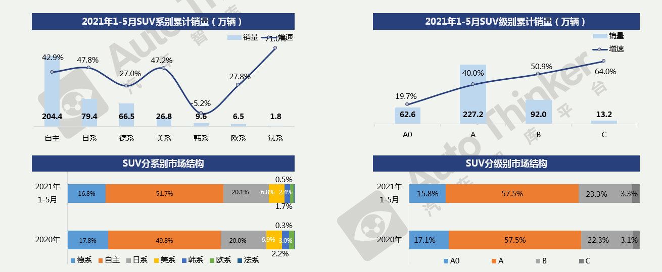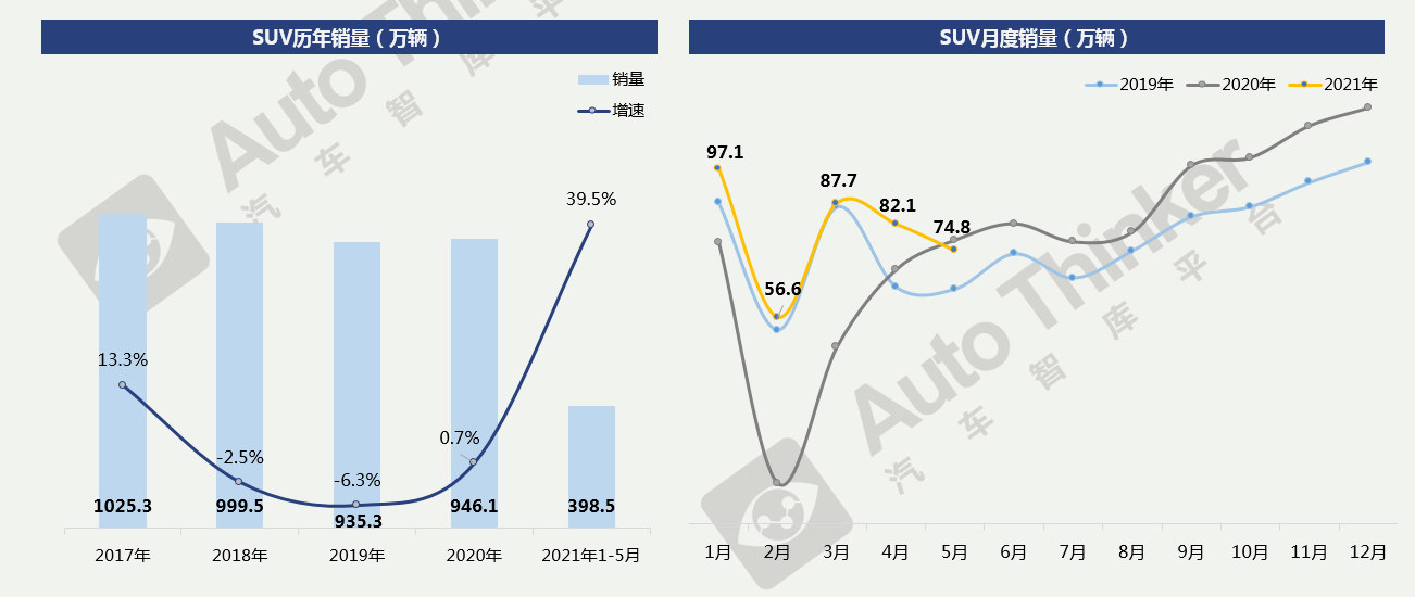2021年1-5月,SUV累计销售398.5万辆,同比增长39.5%。SUV市场的整体表现稍弱于去年同期。