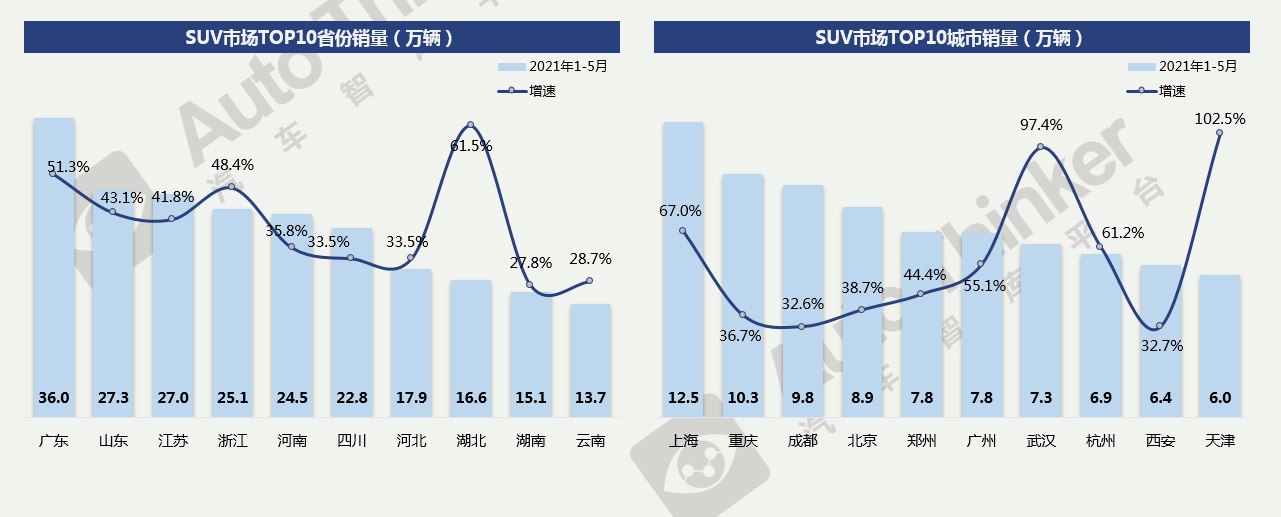 2021年1-5月,前十城市,上海是SUV最大的市场,或受到地理因素的影响,重庆累计销量也超过了10万辆;重庆和武汉的SUV销量则是超过了轿车。