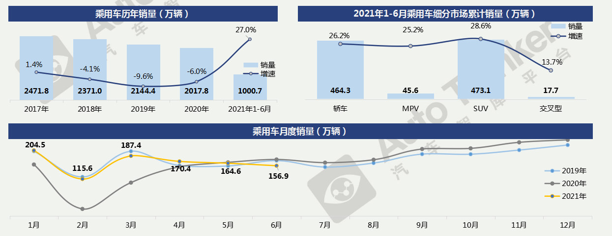 2021年6月,乘用车销售156.9万辆,同比下降11.1%;1-6月,乘用车累计销售1000.7万辆,同比增长27%。从上半年市场情况来看,乘用车在芯片短缺、原材料价格上涨等不利因素影响下,销量依然超过1000万辆。