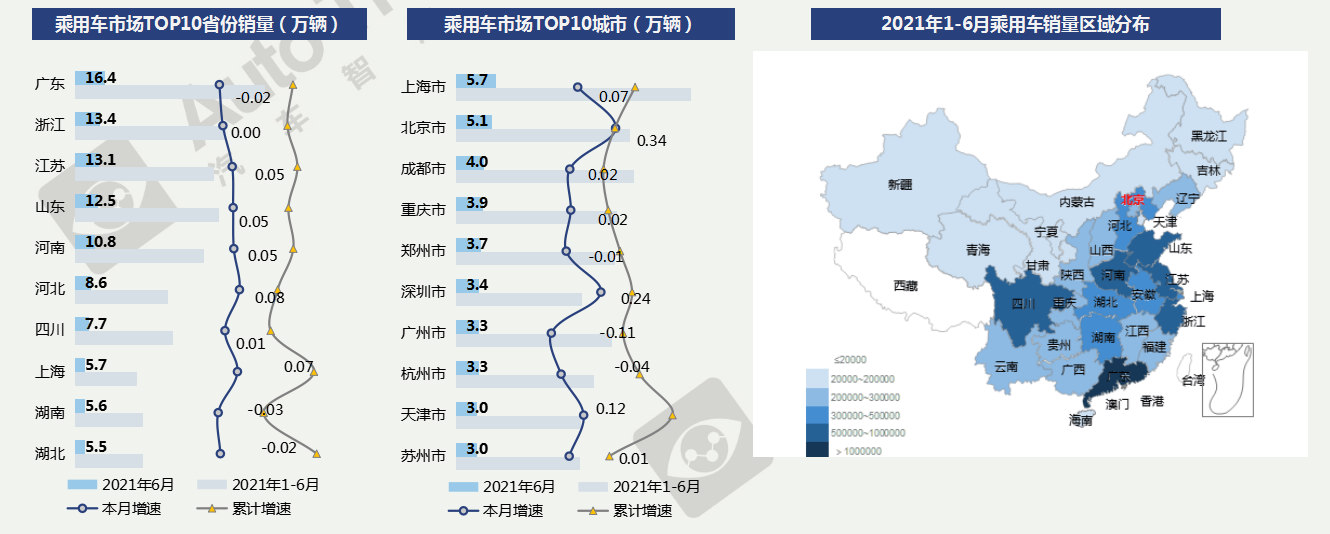 从省份上看,6月,广东夺得本月销量和累计销量双料第一,浙江和江苏分列二三位,前五名省份单月销量均在10万辆以上。