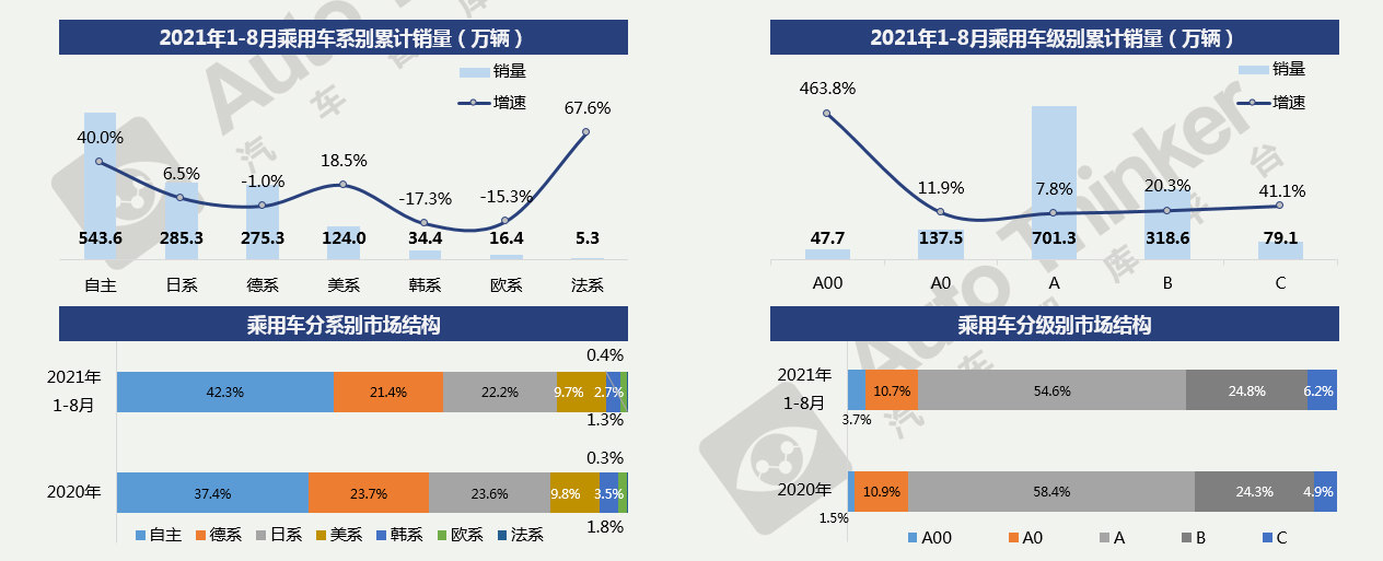 2021年1-8月,自主品牌乘用车共销售543.6万辆,同比增长40.0%,占乘用车销售总量的42.3%,占有率比上年同期有所提升。其他系别中,与上年同期相比,德系、韩系、欧系增速有所下降,美系依然保持一定增长,法系增幅依然最高。