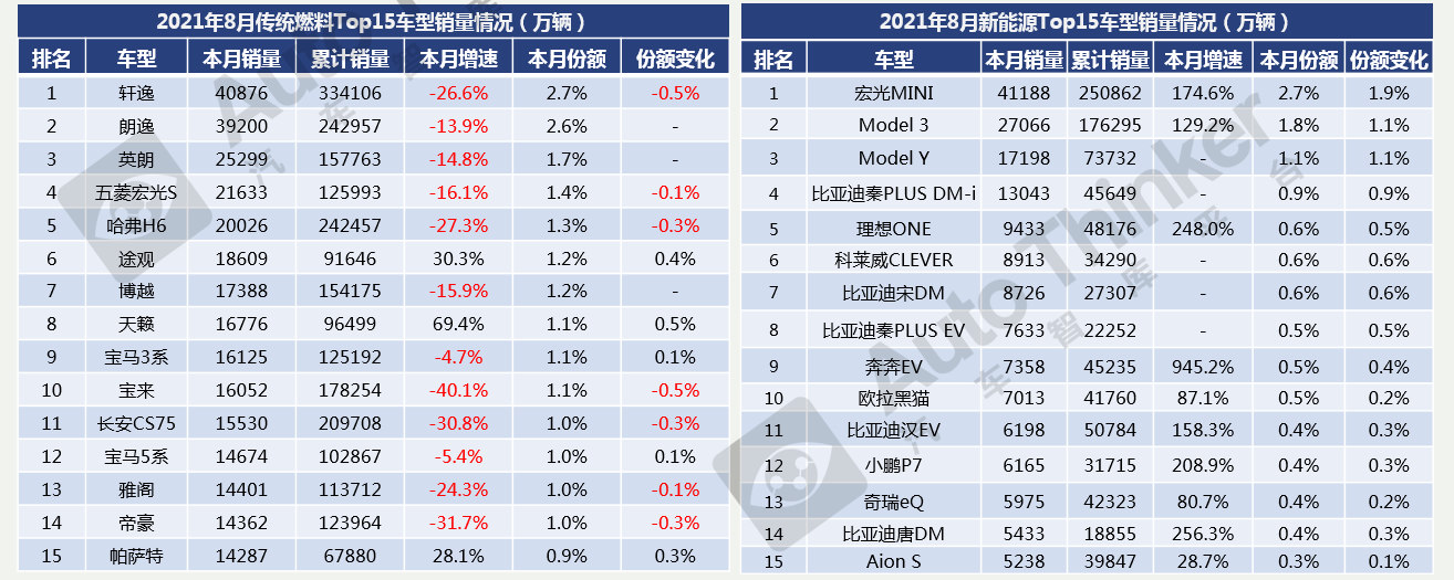 8月传统燃料TOP15车型中,轩逸继续稳居单月和累计销量双料榜首。五菱宏光S本月升至第四位,也是Top15车型中唯一一款MPV车型。受到市场整体销量下滑影响,传统燃料车型中多数车型本月均未能实现增长。