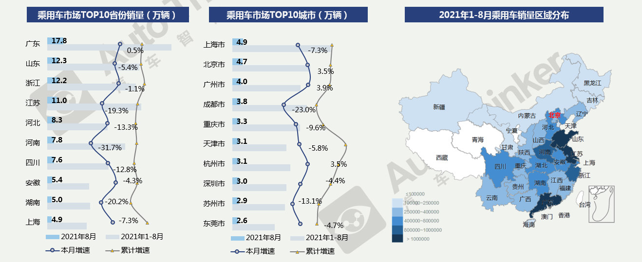 从省份上看,8月,广东夺得本月销量和累计销量双料第一,同时也是前十省份中唯一保持增长的省份。其余省份受到市场整体下行影响,均未能实现增长。