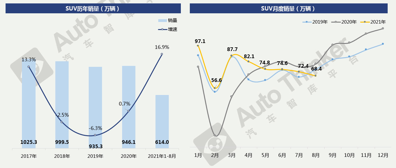 2021年1-8月,SUV累计销售614.0万辆,同比增长16.9%。进入5月以来,SUV市场的整体表现稍弱于去年同期,市场下行压力不断加大。