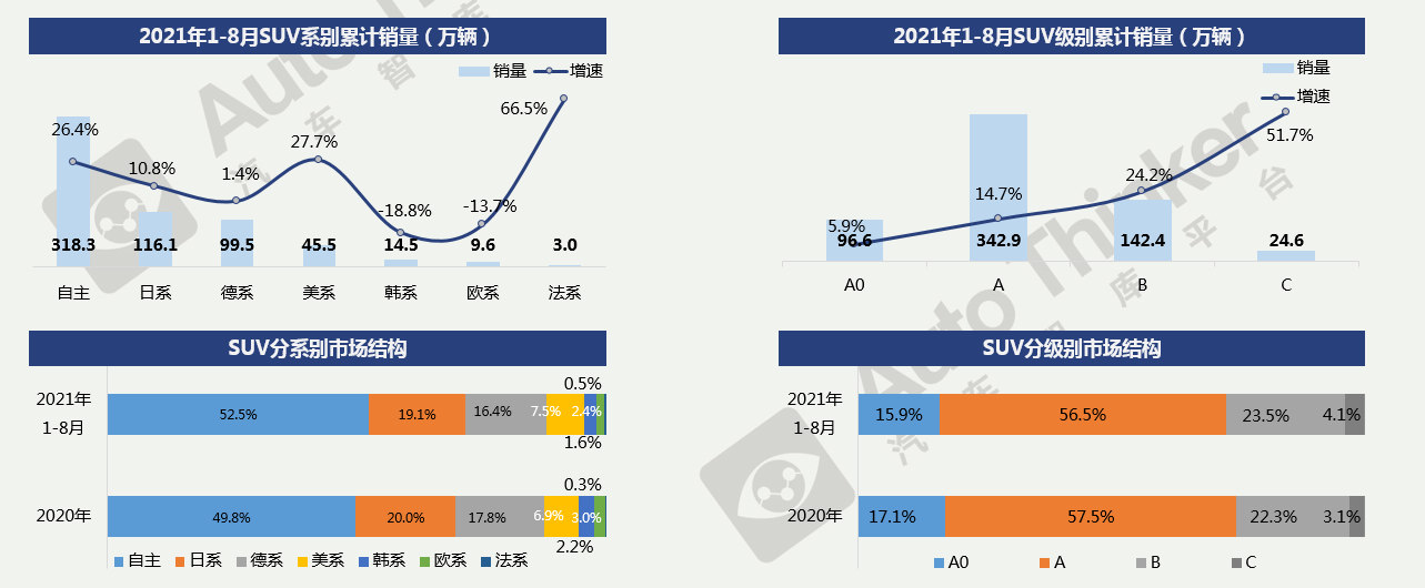 2021年1-8月,自主品牌在SUV市场的领先地位进一步增强,占据市场过半份额,其他系别的份额被进一步压缩。自主、日系、德系占据市场近80%的份额。