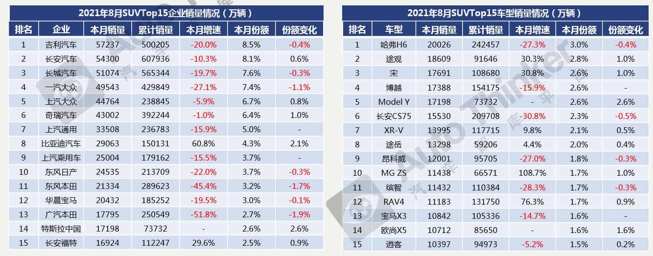 2021年8月,SUV销量为68.4万辆,比2020年同期下降14.4%,比2019年同期下降8.5%,环比下降5.6%。今年首月三指标同时下降,且降幅进一步扩大。