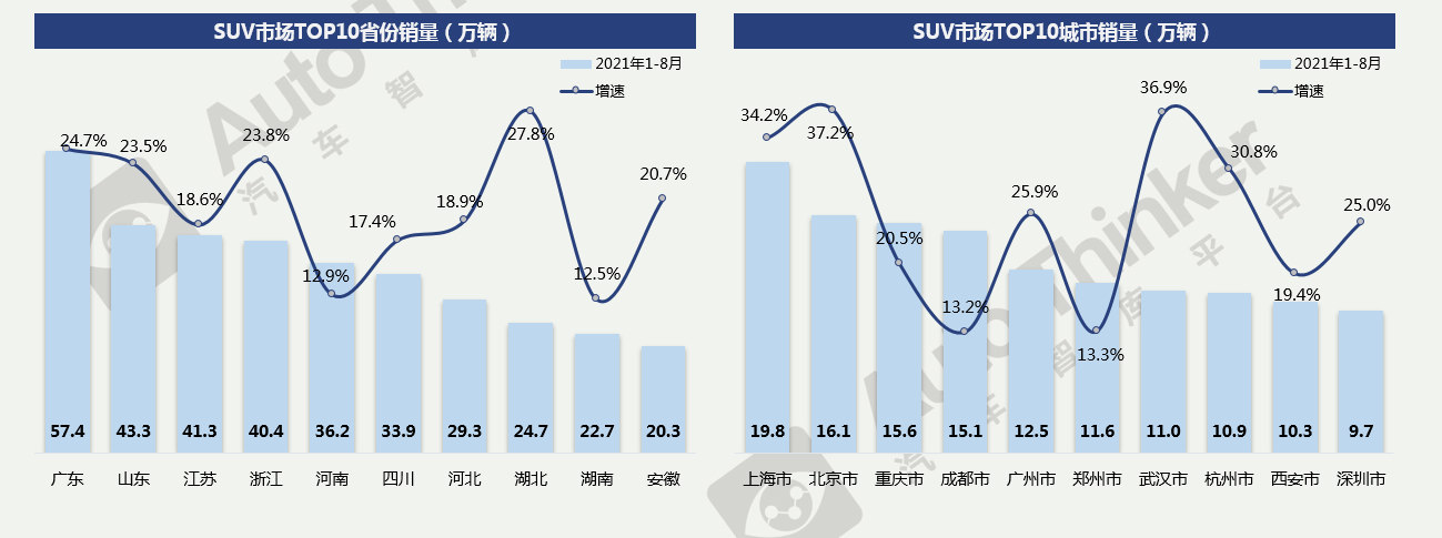 2021年1-8月,前十城市,上海是SUV最大的市场,上海、北京、武汉、杭州SUV市场销量增速相对较高。