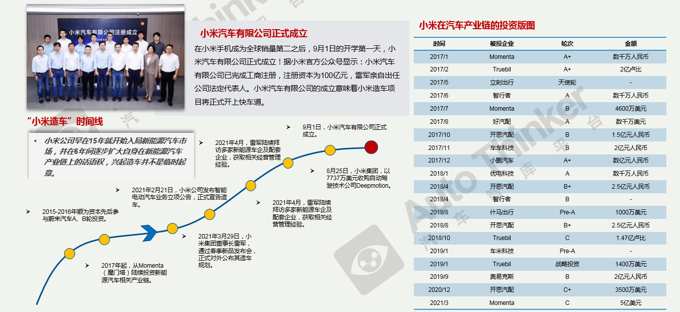 9月1日,小米汽车正式注册,公司名:小米汽车有限公司,注册资金100亿,小米董事长兼CEO雷军担任法人代表。