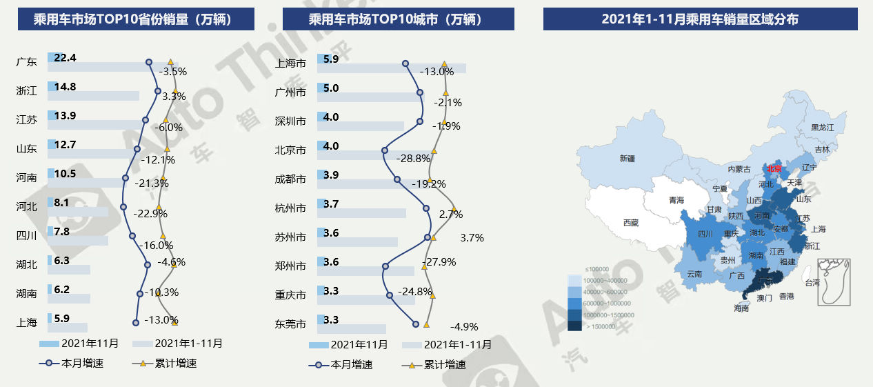从省份上看,11月,广东(22.4万辆)、浙江(14.8万辆)、江苏(13.9万辆)位列前三,前十省份合计销量108.7万辆,占总体市场销量的63.5%。