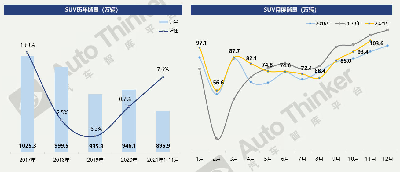 2021年11月,SUV销量为103.6万辆,比2020年同期下降4.9%,比2019年同期增长10.7%,环比增长10.9%。本月同比降幅收缩1.9%,环比涨幅增加1.0%。