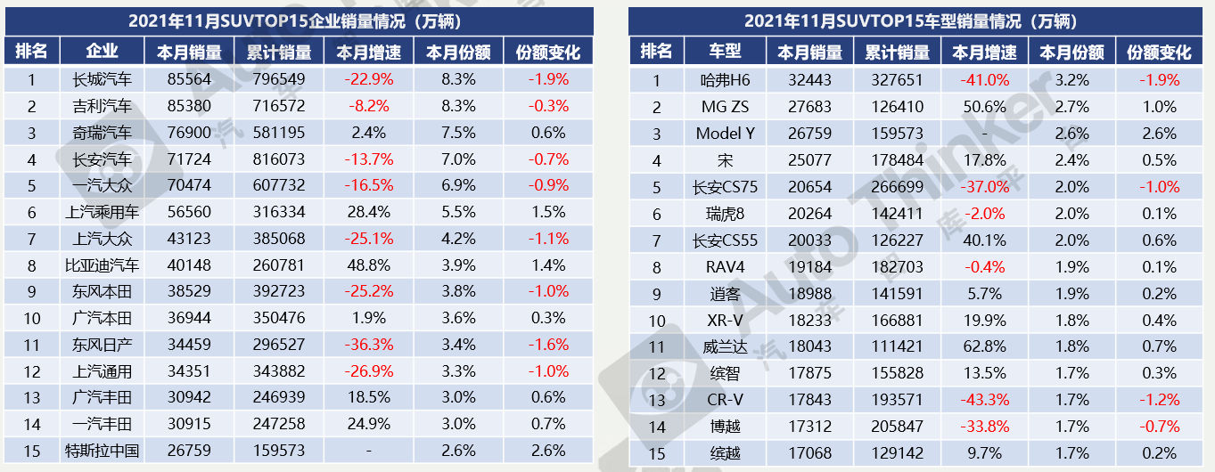 2021年1-11月,SUV累计销售895.9万辆,同比增长7.6%。进入5月以来,SUV市场的整体表现稍弱于去年同期,今年整体市场情况或不及预期。