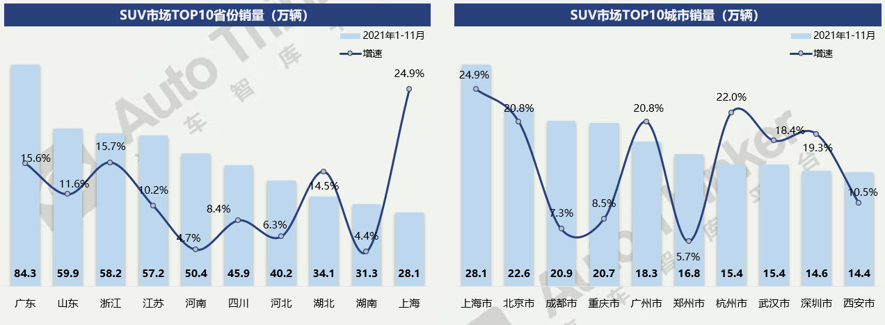 1-11月,TOP10城市中,销量前三城市为:上海(28.1万辆)、北京(22.3万辆)、成都(20.9万辆);TOP10城市合计187.2万辆,占比市场总额22.4%。从增长方面来看,上海、北京、广州、杭州四地增速相对较高。