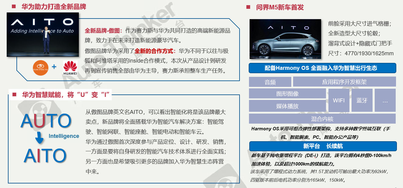 12月2日,赛力斯汽车联合华为发布了其合力打造的高端品牌——傲图(AITO)。在发布会现场旗下首款车型问界M5也同步亮相。