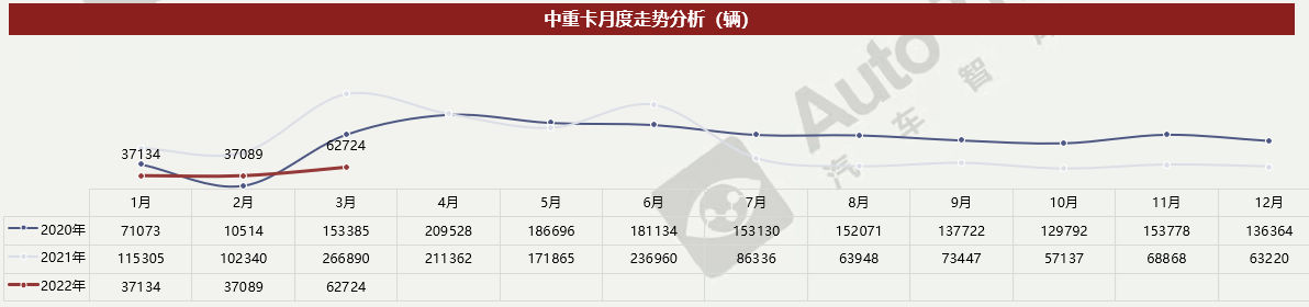 2022年3月,中重卡市场销售6.3万辆,同比下降76.5%;