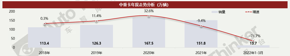 2022年1-3月,中重卡市场销售13.7万辆,同比下降71.7%。