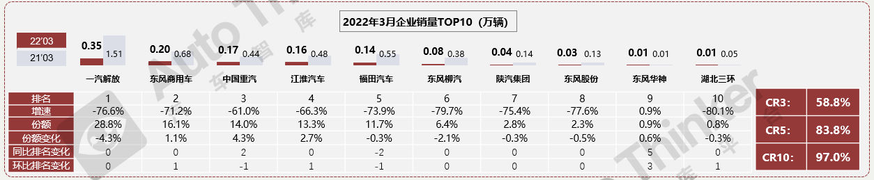 2022年3月,载货车市场一汽解放、东风商用车、中国重汽销量占据前三名,其中一汽解放销量达到0.35万辆,同比下降76.6%;