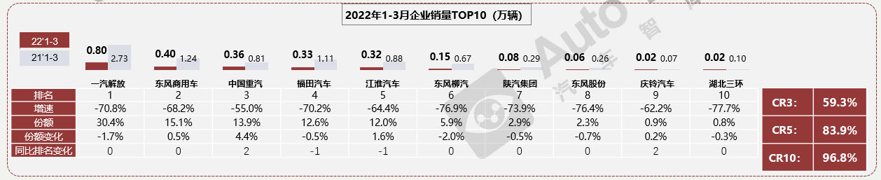2022年1-3月,载货车市场一汽解放、东风商用车、中国重汽销量占据前三名,其中一汽解放销量达到0.8万辆,同比下降70.8%;。