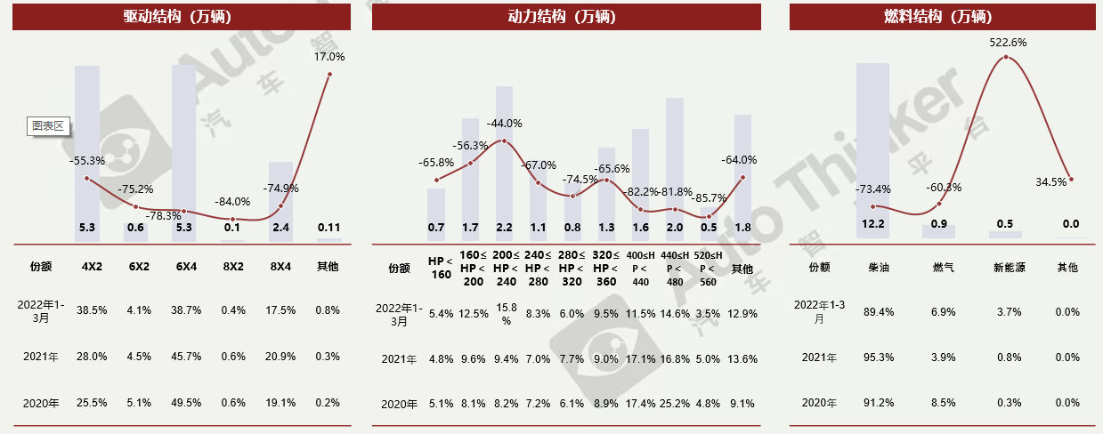 2022年1-3月,驱动结构方面6×4销量占据第一位,销量达到5.3万辆,同比下降78.3%;2022年1-3月,动力结构方面200≤HP<240销量占据第一位,销量达到2.2万辆,同比下降44%;2022年1-3月,燃料结构方面柴油销量占据第一位,销量达到12.2万辆,同比下降73.4%。