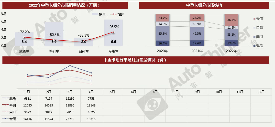 2022年4月,专用车销量占据第一位,销量达到1.6万辆,同比下降70.2%;2022年1-4月,专用车销量占据第一位,销量达到6.6万辆,同比下降56.5%。