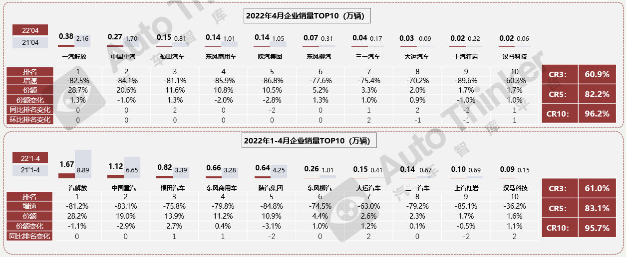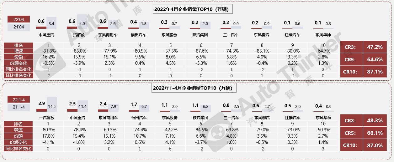 2022年4月,中重卡柴油车市场中国重汽、一汽解放、东风商用车销量占据前三名,其中中国重汽销量达到0.6万辆,同比下降81.8%;2022年1-4月,中重卡柴油车市场一汽解放、中国重汽、东风商用车销量占据前三名,其中一汽解放销量达到2.9万辆,同比下降80.3%。