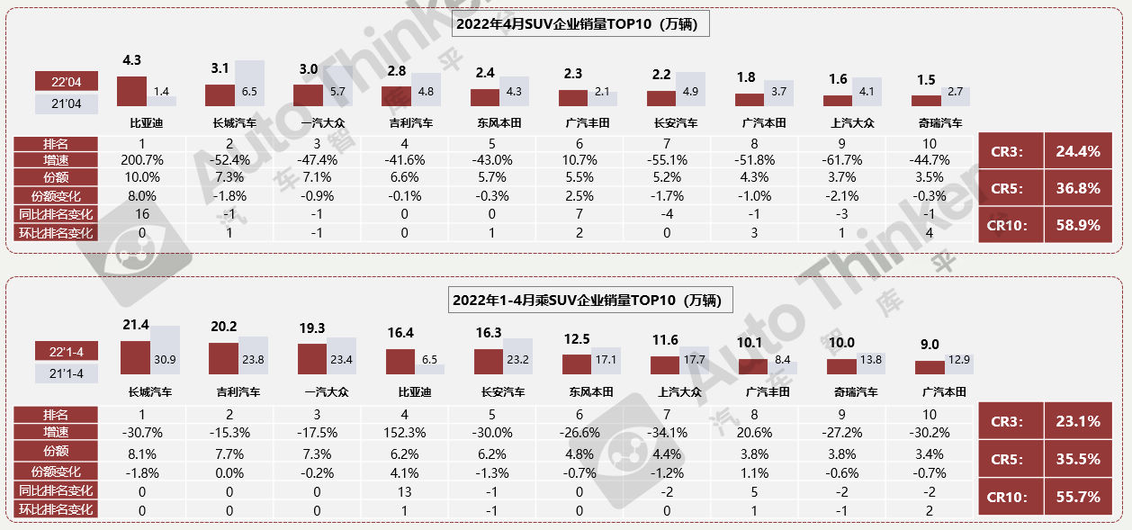 销量月报2022年4月SUV市场销量TOP10企业中,比亚迪、长城汽车、一汽大众排名前三,其中比亚迪汽车销售4.3万辆,同比增长200.7%;