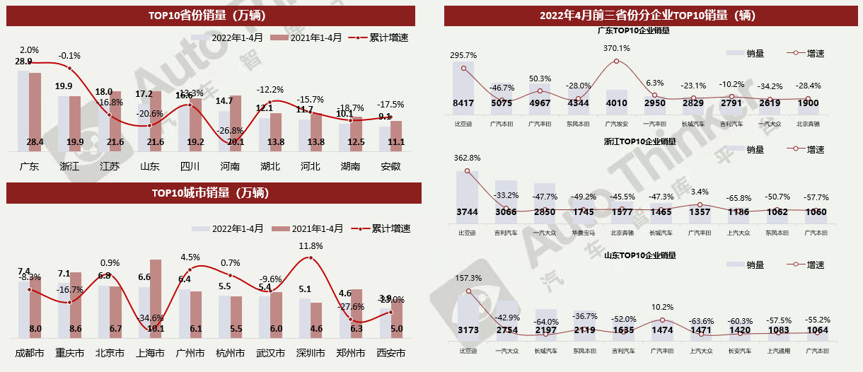 2022年1-4月,广东销售28.9万辆,同比增长2%;浙江销售19.9万辆,同比下降0.1%;江苏销售18万辆,同比下降16.8%;