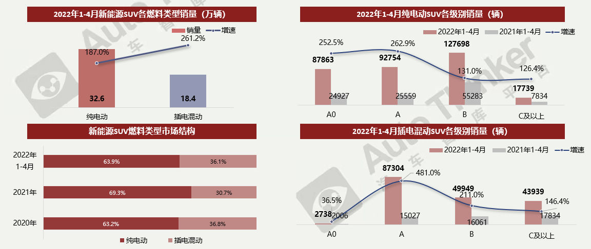 2022年1-4月,纯电动SUV销售32.6万辆,同比增长187%;插电混动SUV销售18.4万辆,同比增长261.2%;