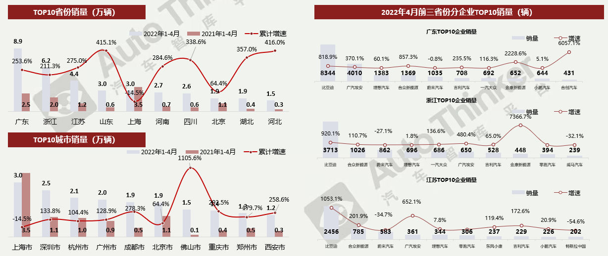 2022年1-4月,广东销售8.9万辆,同比增长253.6%;浙江销售6.2万辆,同比增长211.3%;江苏销售4.4万辆,同比增长275%;