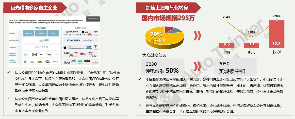 近日,在柏林的一次大众汽车集团董事会上,该公司对2030 NEW AUTO战略进行了阶段性盘点,并讨论了今年工作的优先事项,同时还首次对外曝光了大众汽车集团在品牌、整车、技术平台、软件、电池等领域的主要竞争对手,其中小鹏汽车、蔚来、比亚迪、宁德时代等中国企业在列。