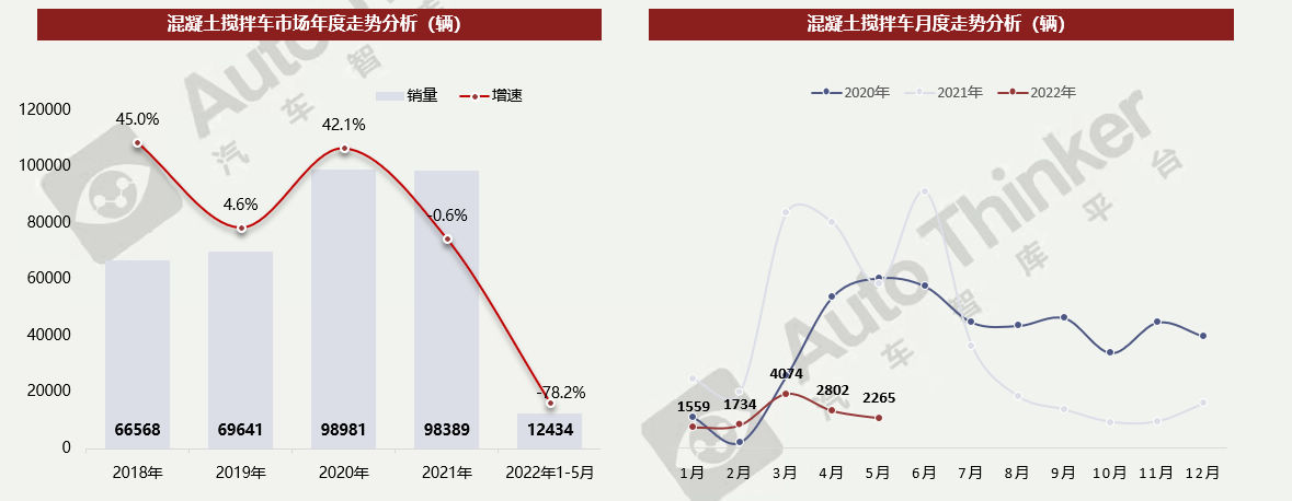 2022年5月,混凝土搅拌车市场销售2265辆,同比下降81.9%;