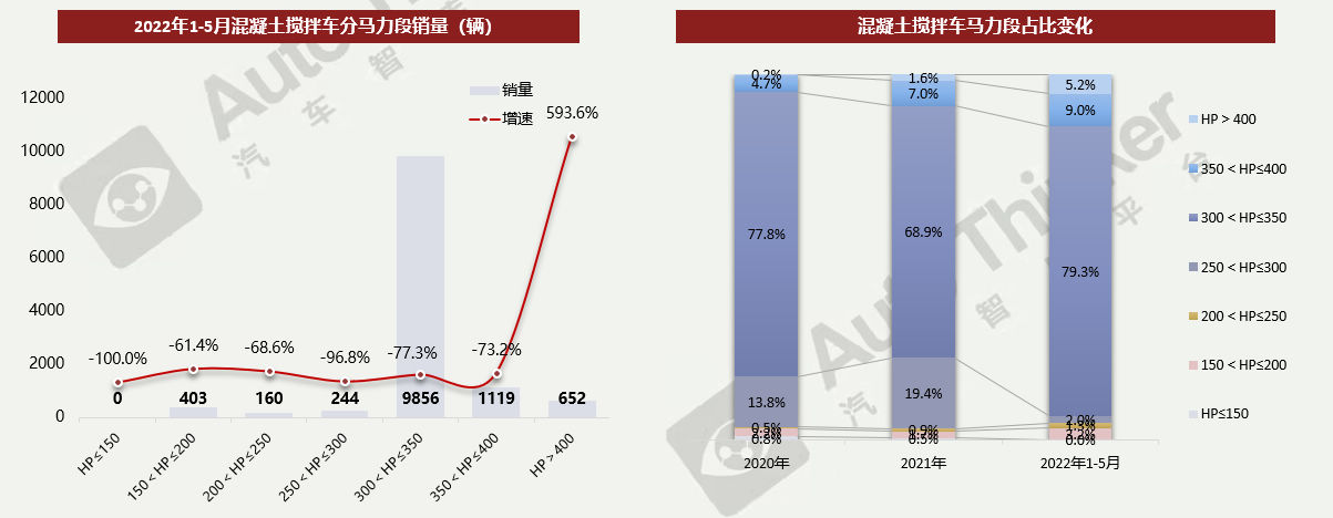 2022年1-5月,马力结构方面主要集中在300<HP≤350马力段,累计销售9856辆,同比下降77.3%,占据市场79.3%的份额,增长3.3个百分点。